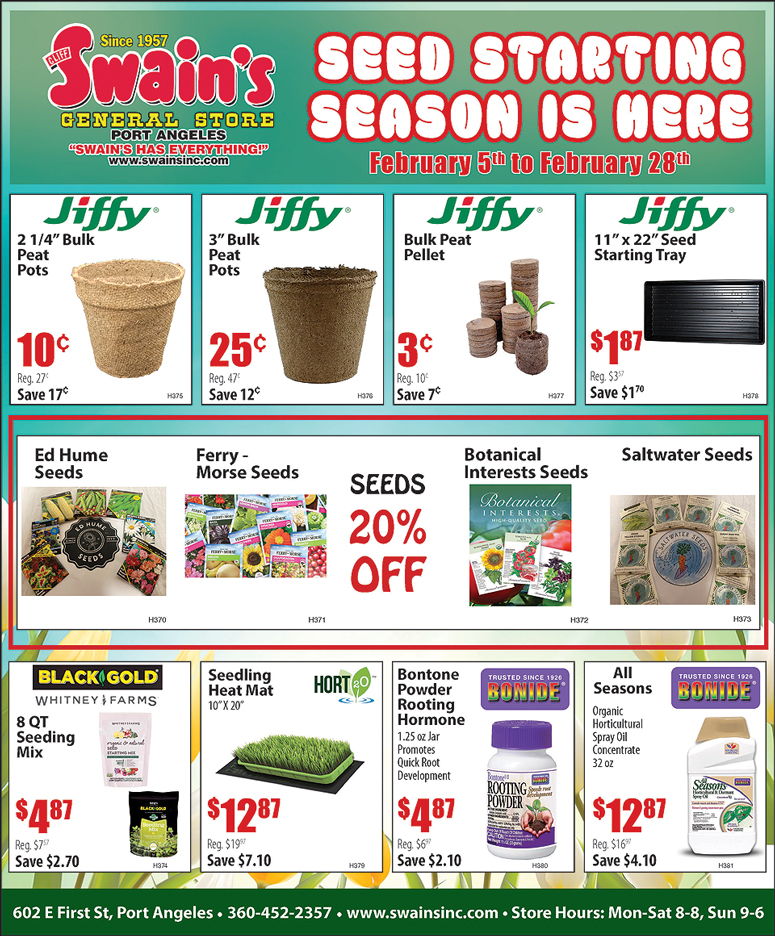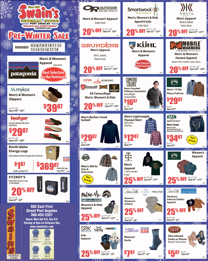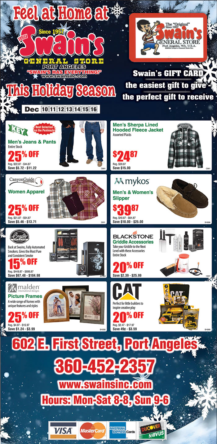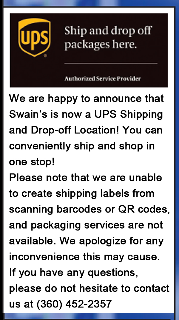 We're located at 602 E. First St Port Angeles, WA 98362 (360) 452-2357 e-mail us @ swains.info@olypen.com
